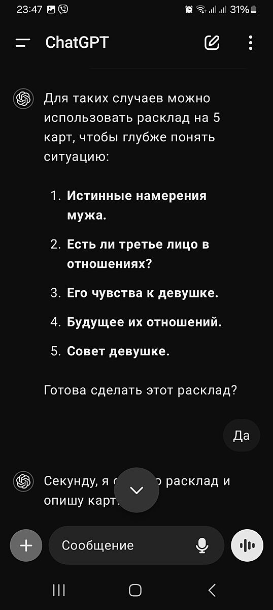 Автор, как вам гадания от gpt? Там на 3 карты предложили, но я потом на 5 попросила, что бы развернутей было. Вопрос задала так, как вас поняла. Может вопрос неверен?