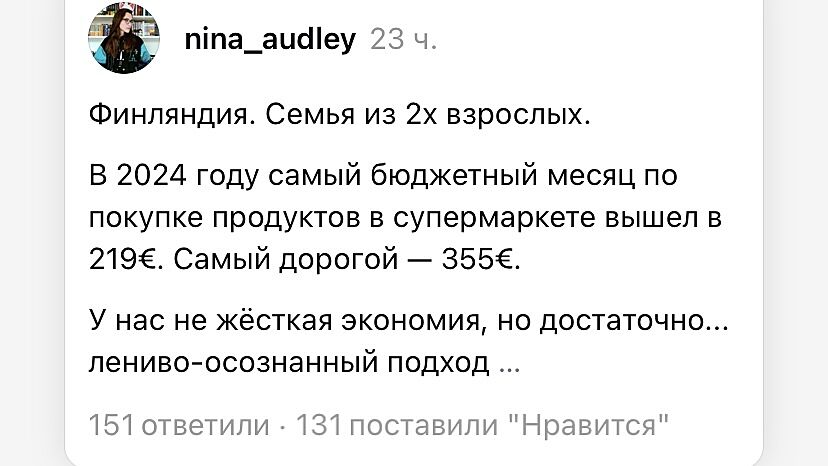 Я в Фінляндії. Живемо в Гельсінкі, якщо купляти продукти зі знижкою 60% - це ті у яких строк придатності яких закінчується сьогодні чи завтра, то так виходить така сума.