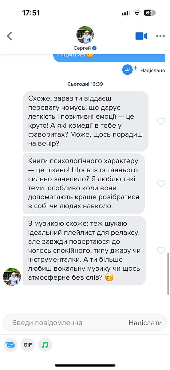В анкеті написано , там де про себе: Захоплююсь йогою та латино-американськими танцями, люблю подорожувати... Потім є одне фото в моєму профілі , де я з собакою на прогулянці. Можна було зачепитись за це і продовжувати розмову в цьому руслі. А потім вже запитувати інше.