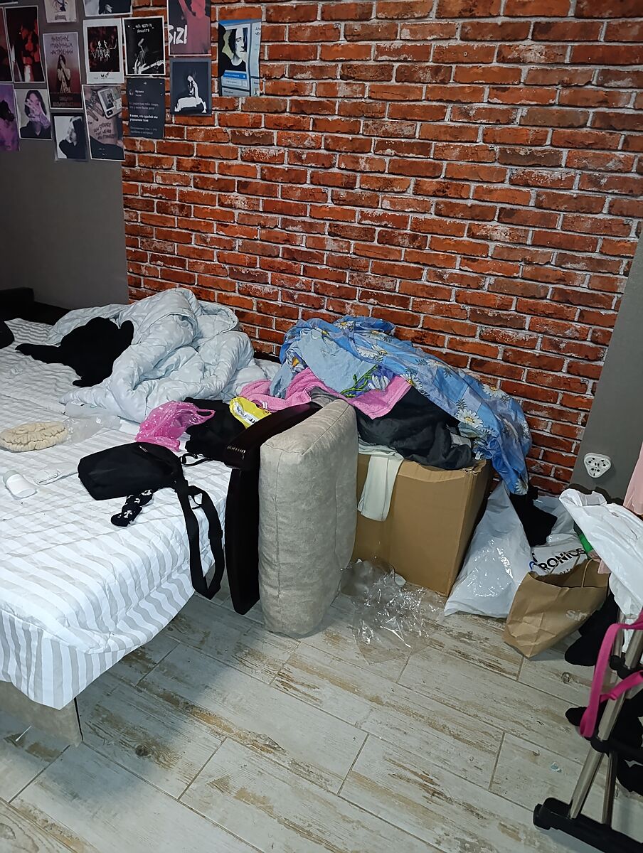 Это переехали на новую квартиру ,ее комната ,скажем туда ещё полностью не переселились.Но она учиться в Польше ,то ее комната для каникул.Иам стоит передвижная вешалка ,там она что-то вешает но так все валяеться.