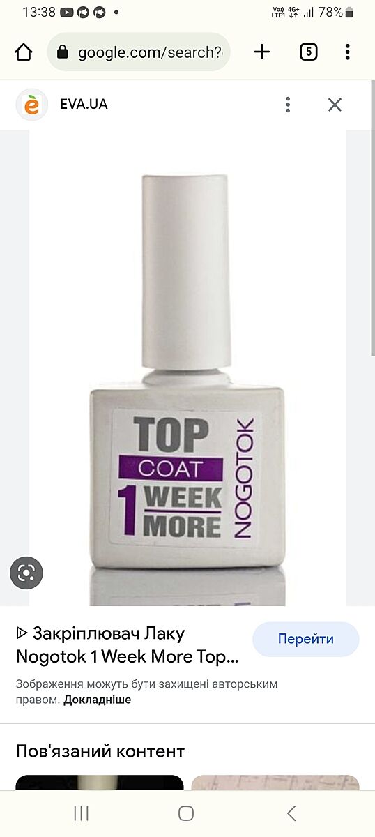 Я зараз на перерві від гель-лаку, та й раніше періодично звичайними лаками користувалась, треба швидкосохнучий топ, у мене був ноготок в білій пляшечці, 1 тиждень називався, якось так, але давно їх нема в продажу і Seche vite, топ густіє як десь пів пляшечки залишається, але сохне - огонь, ніяких відбитків потім. А ще додаю скрін топу-сушки Малава, тут дівчата якось радили, я не спробувала. Топ в синій пляшечці сохне повільніше, мені не так сподобався, ефект типу гель-лак, але не то-(