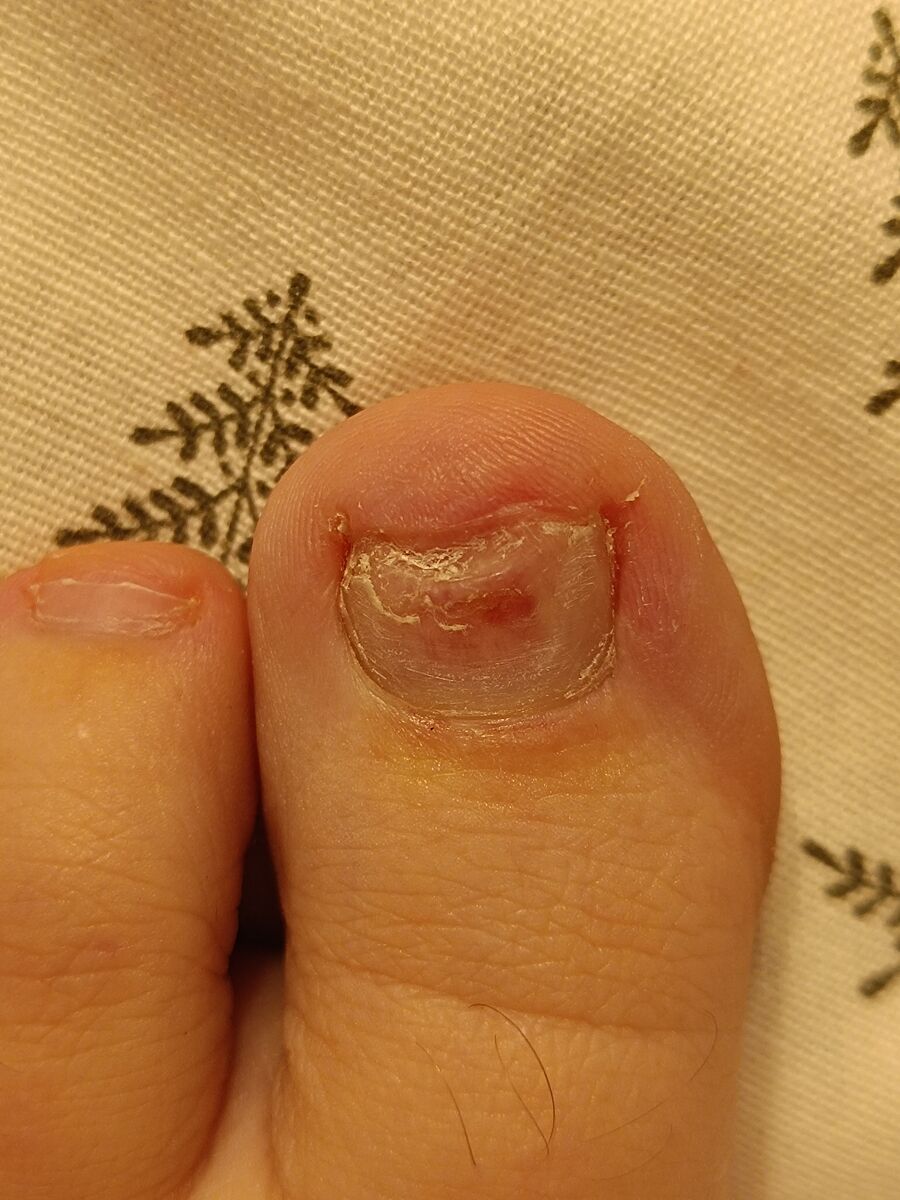 Девочки, проблема началась более 10 лет назад. На палец наступил очень большой мальчик, появилась гематома под ногтем ( нагрели иголку, прожгли ноготь,вышла кровь) и вот ноготь начал расти до этого прожига а дальше утолщается и под ногтем много тканей сухих . Анализ на грибок делала, не обнаружено. Я спиливаю толстый слой ногтя пилкой, под ним что то красно -корисневое ,и потом мокнет сам ноготь. Что делать? В округе хороших подлогов нет. Делали несколько лет назад ,протезирование ногтя,но ничего не помогло, удаление ногтя до этого места полная зачистка тоже ничему не принесло. Фото только сделала.