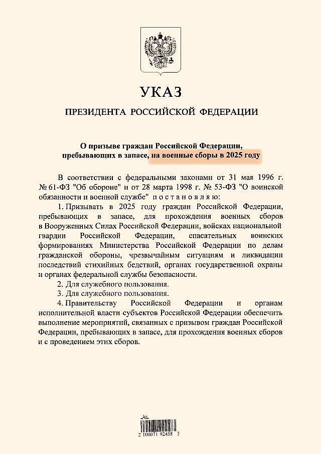 Президент РФ Владимир Путин подписал указ о призыве на военные сборы в 2025 году россиян, пребывающих в запасе.
