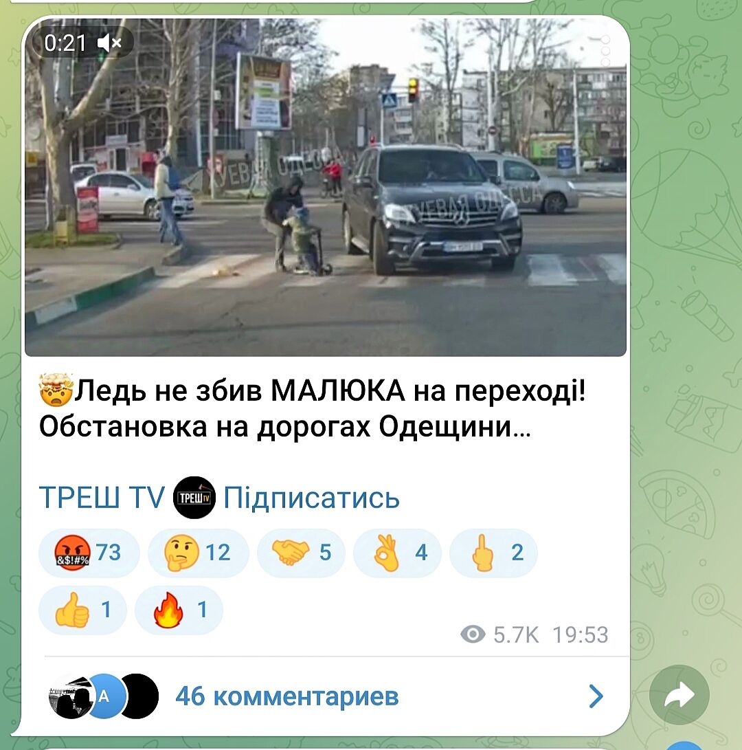 З яких це пір пішохідний перехід став проїзжою частиною чи батьки не розуміють, що треба встати з того транспортного засобу та йти, бляха, ногами, а перед цим впевнетись, що ти в безпеці і можна йти.
