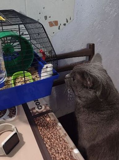 Мой охотник знакомится)) но стоит хомяку пошевелиться, он убегает))