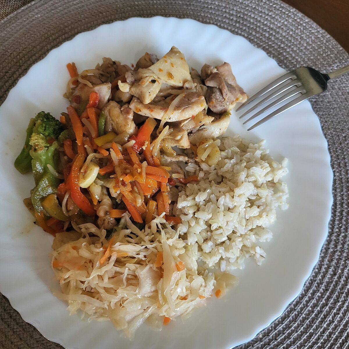 Отварное куриное филе + гречка + зелёный лук + кабачковая икра.