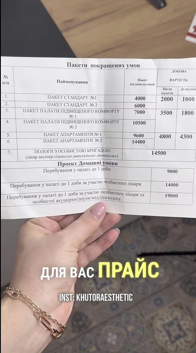 В 5-му пологовому є офіційний прайс, для оплати через касу, різні види палат, оплата участі в пологах обраного лікаря чи чергової бригади