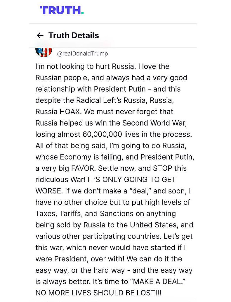 ▪️Я збираюся зробити росії, чия економіка зазнає краху, і президенту путіну дуже велику послугу. Домовтеся зараз і припиніть цю безглузду війну. Далі буде тільки гірше.