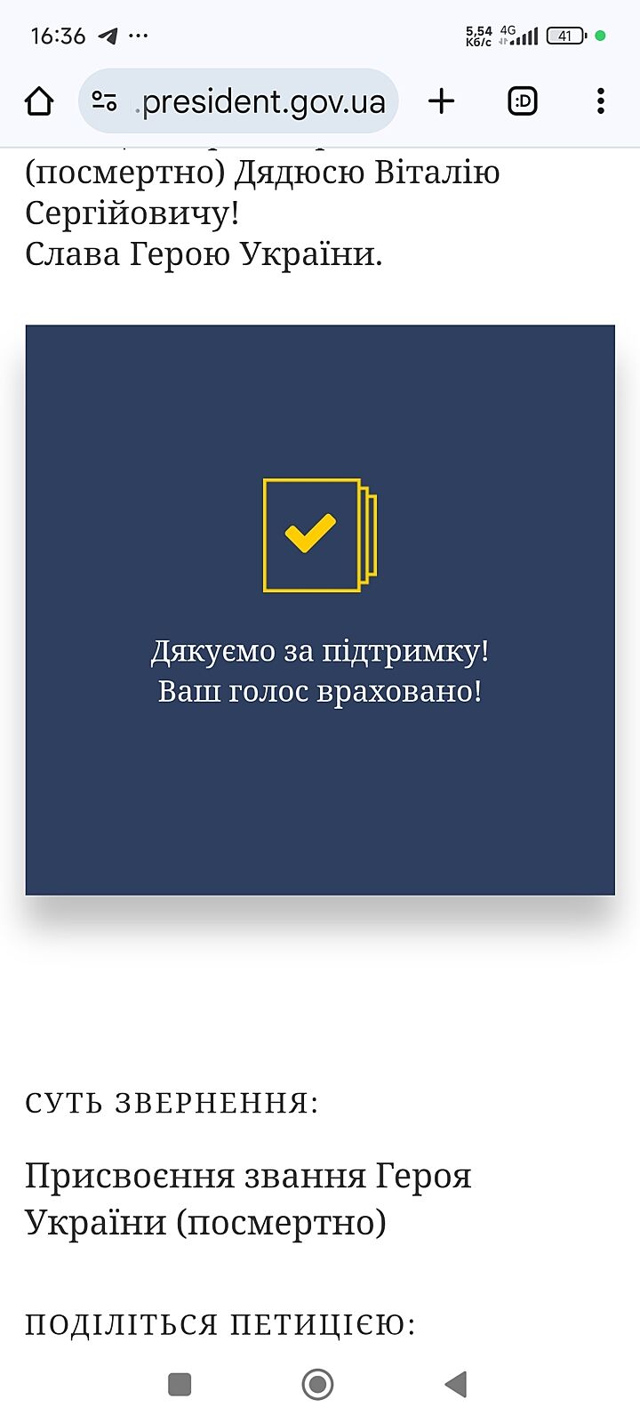 Дядюсь Марія Василівна, мама Дядюся Віталія Сергійовича, старшого стрільця-оператора 2 штурмового відділення 2 штурмового взводу 3 штурмової роти 1 штурмового батальйону в/ч А4638, прошу Вас присвоїти моєму сину звання Героя України (посмертно).Дядюсь Віталій народився 06.11.2005 року в селищі Войнилів, Калуського району, Івано-Франківської області. У серпні 2024 року мій син, Дядюсь Віталій Сергійович, вступив до лав Збройних Сил України на основі контракту, згідністю боронив тереторіальну цілістність нашої держави на сході країни, а саме: У Харківській області