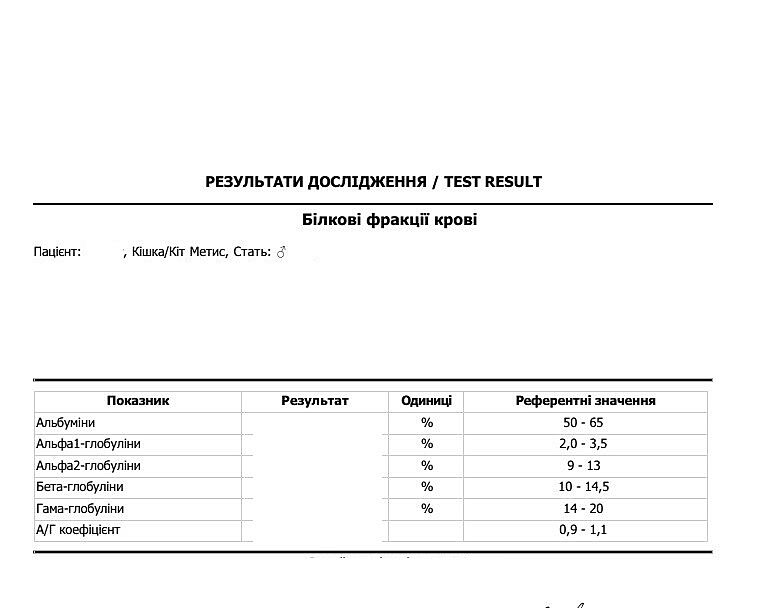Анализ на белковые фракции, по которому косвенно можно предположить ФИП, ветеринары отправляют в лабораторию для животных Бальд в Киеве. Его делают там аж 10 дней, т.к. большая очередь. Это колоссальная потеря во времени начала лечения. Но, в некоторых лабораториях для людей можно договориться, взять у них пробирку для крови, и принести потом ее с кровью на анализ, результат на следующий день и дешевле. Нормы там примерно одинаковые и для котов и для людей. Если будет нужно, у меня есть нормы этого анализа для котов.