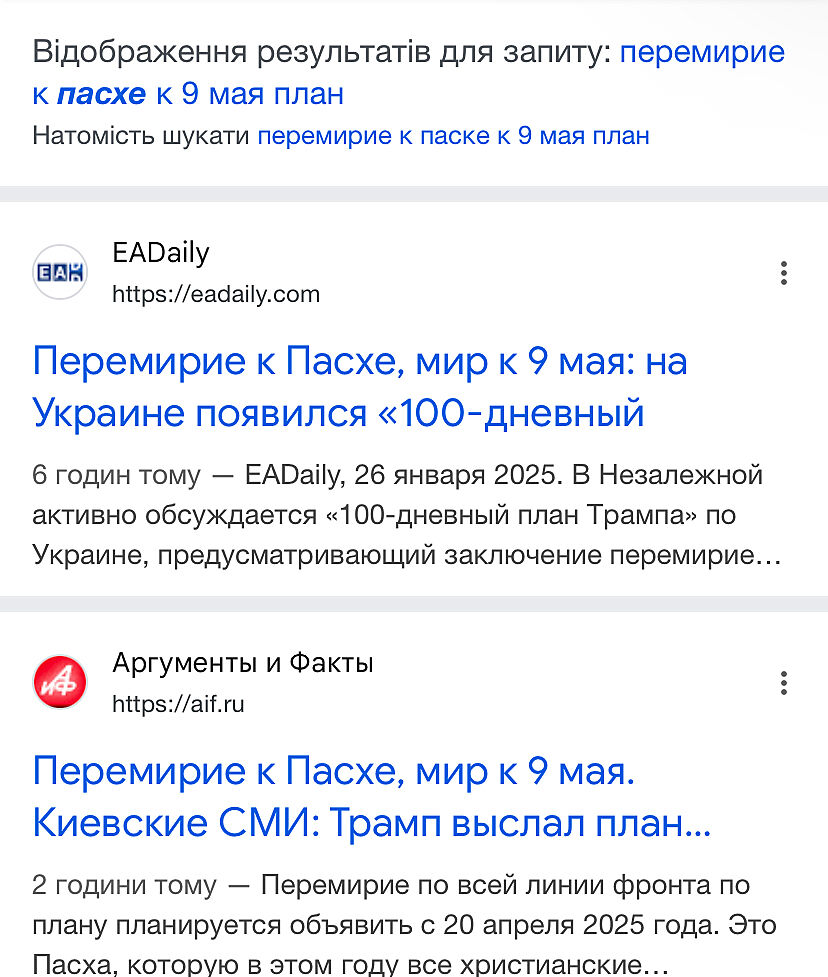 В воскресенье, 26 января, в сети обнародовали якобы ’мирный план Трампа’ для завершения войны в Украине за 100 дней, до 9 мая 2025 года. Такой ’план’ включает переговоры Трампа с украинскими властями и российским диктатором Владимиром Путиным, ’перемирие’ на Пасху.