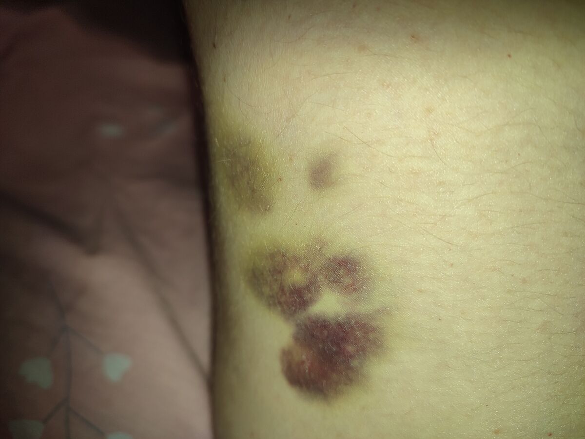 Жарти жартами, але мені здається, це ту мач. Мені навіть боляче не було. Зачесалась нога, я трохи надавила. На наступний день такі синці від пальців