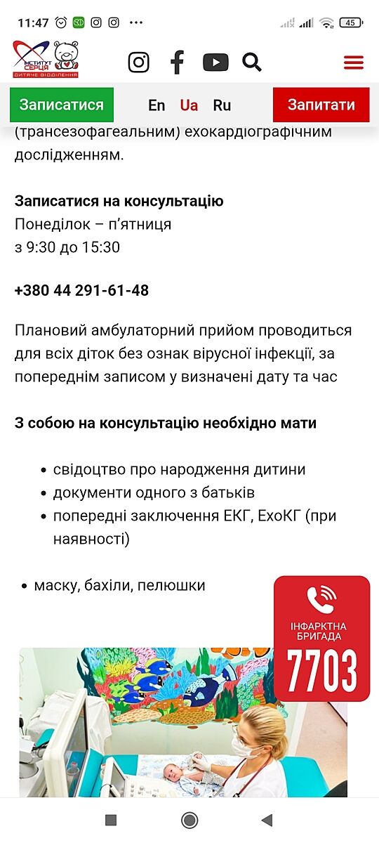 Дитина 15 років перенесла грип, є ускладнення на серце. Хочу записати її на консультацію до кардіолога (УЗІ та кардіограму) в інститут серця, але вже 2 дні ніяк не знайду як. Усі телефони вказані на сайті не відповідають (береться слухавка і тиша), на пошту писала, теж тиша.