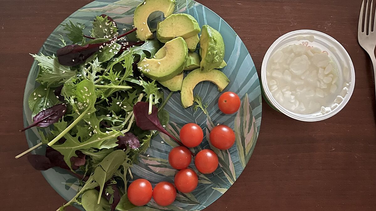 Сегодня утром зелень приправленная кунжутным маслом, половинка авокадо, черри и творог