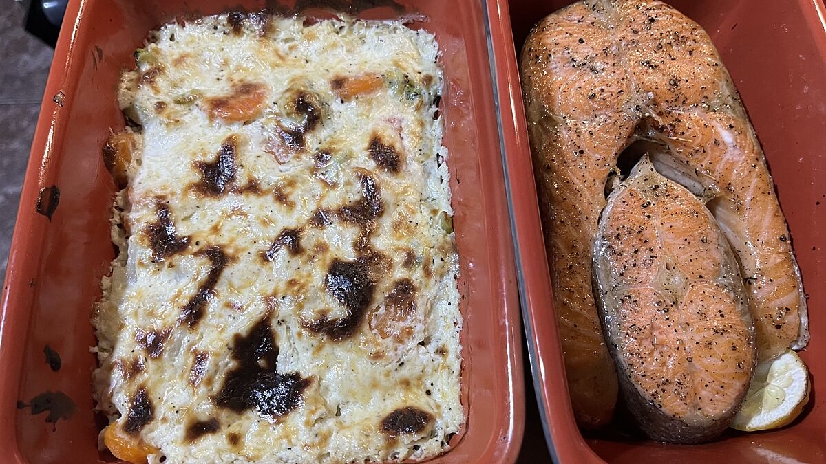 Вечером стейк лосося с овощной запеканкой из брокколи