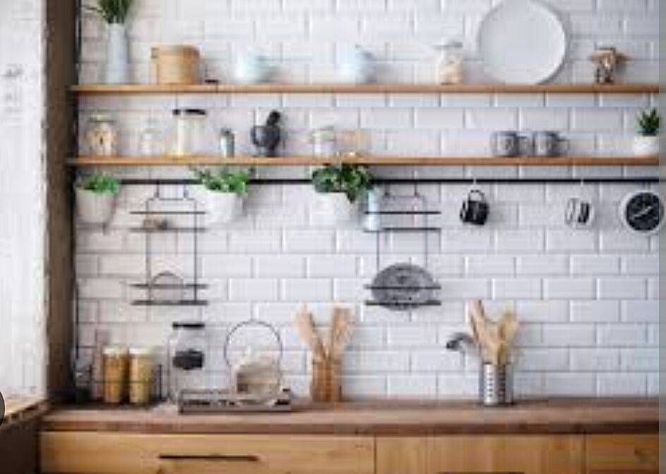 Открытые полки из юска, но на кухне это не очень практично, перемывать их и всё, что на них стоит нужно будет очень часто, если вы активно готовите