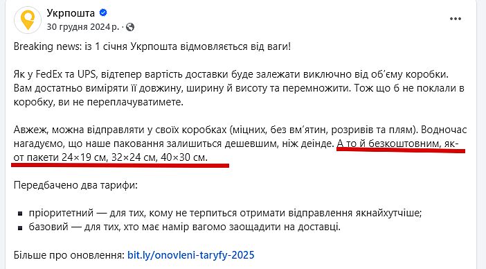 так, в 2024 році відправляла по 45 грн посилки укрпоштою (в мене є один товар стандартної ваги 1 кг і пакування стандартних розмірів, тому можу порівняти), зараз ця ж посилка вагою 1 кг коштує 97 грн в село, 77 грн в місто. Це так вони скоригували свої тарифи, ’щоб люди не платили зайве за повітря’. Для порівняння - Нова пошта довезе за 80 грн в місто і за 105 в село.