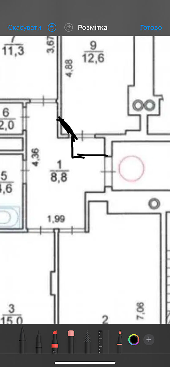 Є квартира для сімʼї з 3 батьки і дитина маленька,Можливо хтось підкаже, є ось таке планування квартири( по факту дві обʼєднані одну, і коридор наче великий, але абсолютно не продуманий в не вистачає місця для елементарної прихожої. Намальовали невеликий варіан змін але виходить що двері кухні навпроти туалету в ходять? Як вважаєте ?