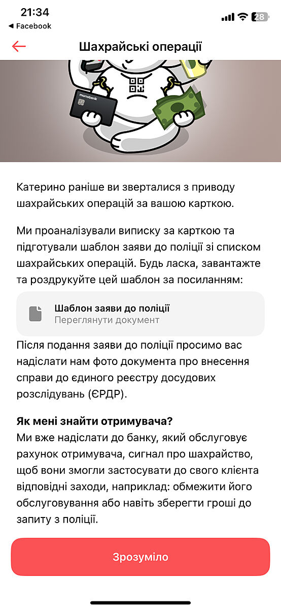 3. Зверніть увагу, що кошти, які були вкрадені шахраями, можуть бути компенсовані ними за рішенням суду. Якщо у вас є договір зі страховою компанією, що передбачає відшкодування збитків від шахрайства, рекомендуємо звернутися до них. Також радимо отримати консультацію кваліфікованого юриста для визначення подальших правових дій