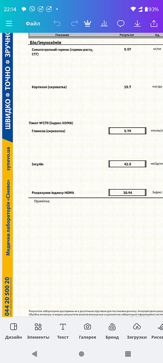 Дуже високий інсулін, тобто є інсулінрезистентність. Коригується харчуванням