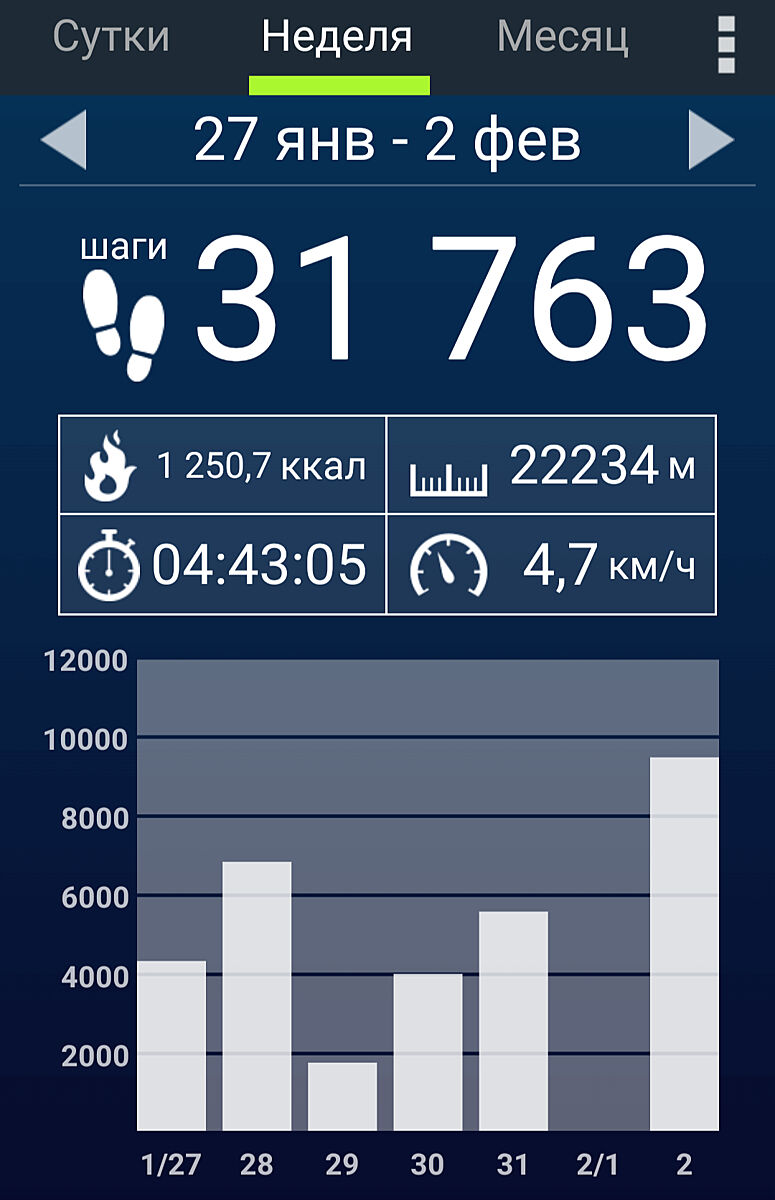 Фитнес браслет минимум стоит 6000 шагов, стараюсь их находить. На выходные 10000