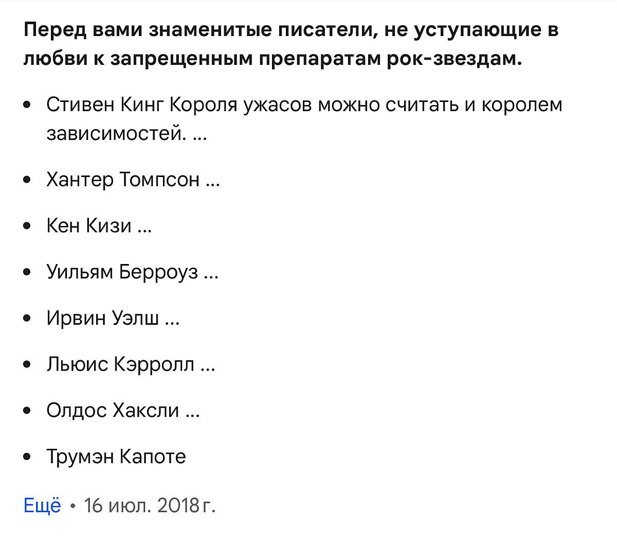 Может вы не знаете, но большинство известных писателей наркоманы или алкоголики. Или просто тихие шизофреники. Даже Гоголь страдал шизофренией, Толстой тоже имел психические отклонения, Хемингуэй был и шизофреником, и наркоманом, и алкашом. И вот вам еще список, который можно продолжить). Но это не отменяет гениальности их творчества.