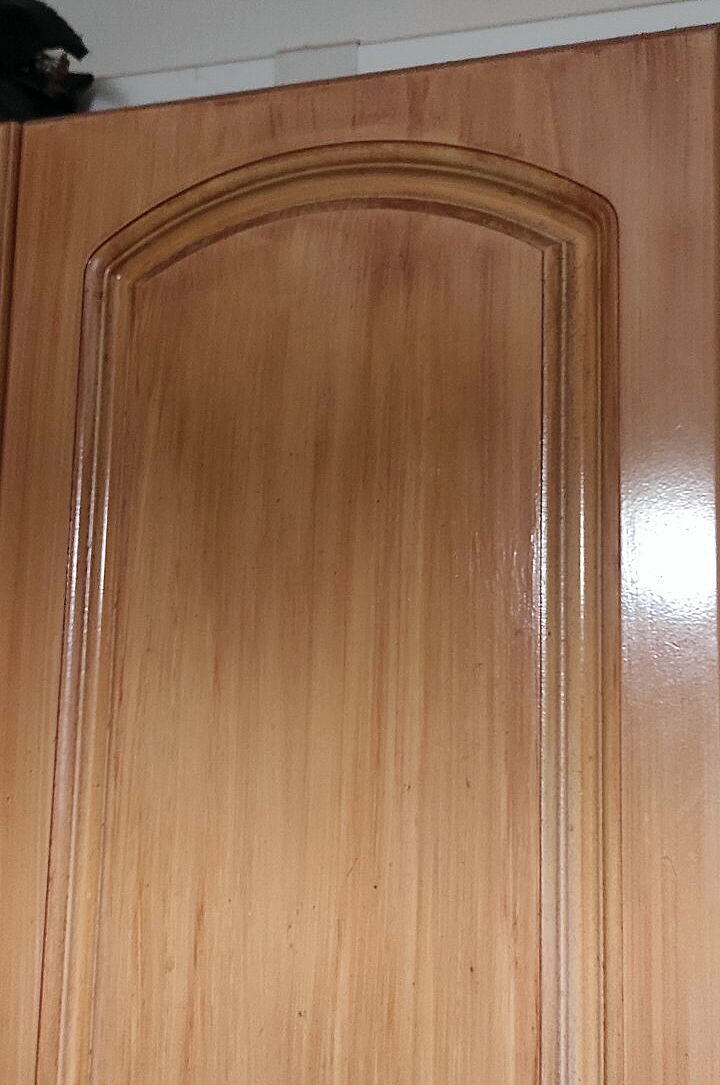 Двенадцать лет назад, после возгорания масла на плите, покоробилась пленка на фасаде. Плёнку содрали, валиком нанесли фон, кисточкой эмитацию под волокна дерева, сверху вскрыли яхтовым лаком. Лучше конечно вскрывать матовым лаком, не так видны дефекты, как на глянцевом.