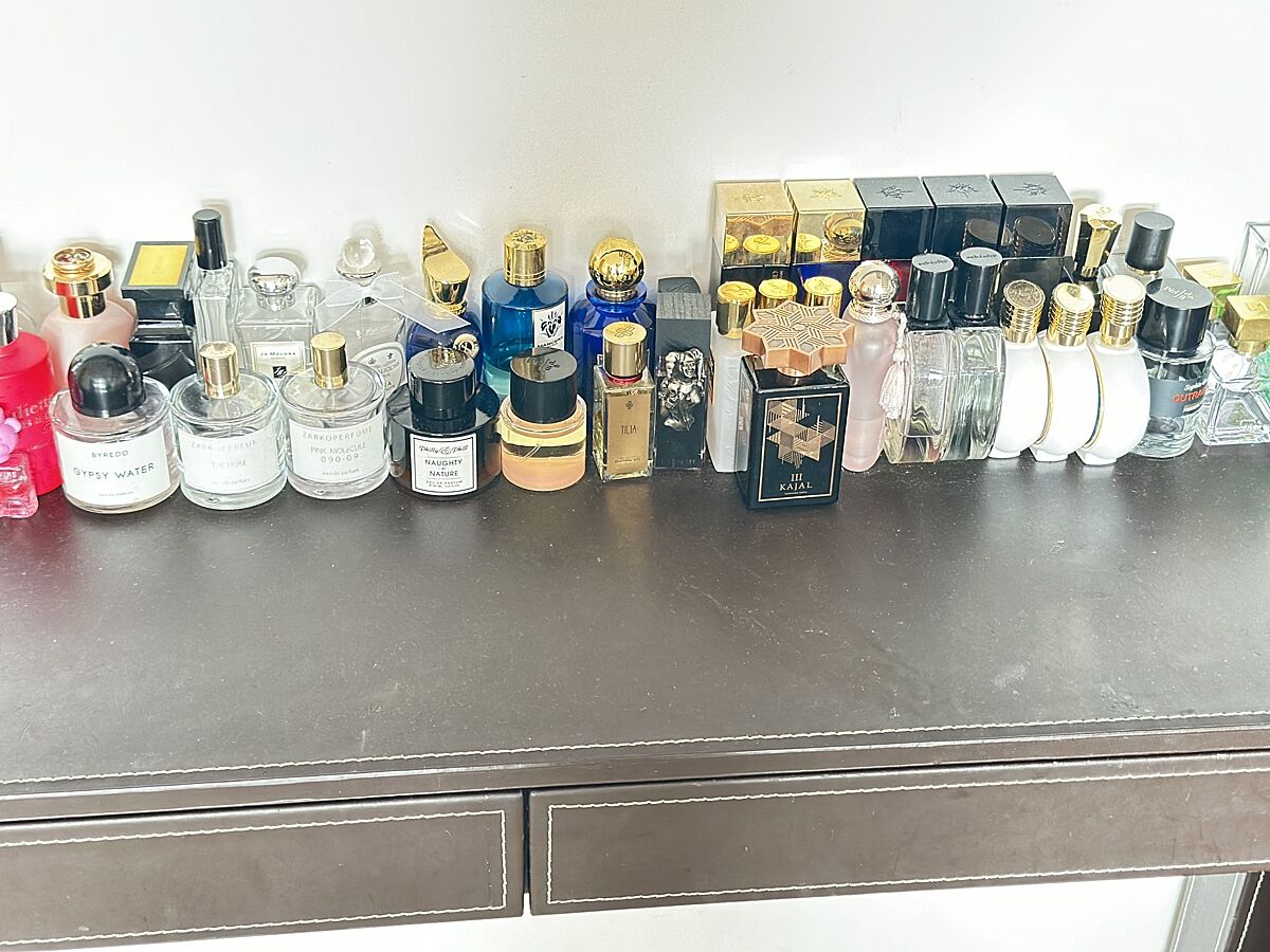 Перечислю что стоИт, ношу не все: Гуччи 2 (бледно-розовый, много лет любимый, попробуй найди его сейчас - давно снят), givenchy very irresistible, Dior Duna, Prada Amber ( тоже любимый), Лалик Аметист, Кляйн Эйфория, Yves Saint Laurent Black Opium (недавно распробовала), еще Хлое, Имперский лес и Босс - пока никак они мне. ТОчнее Имперский лес ну очень странный - не могу к нему привыкнуть, скорее раздражает, чем нравится.
