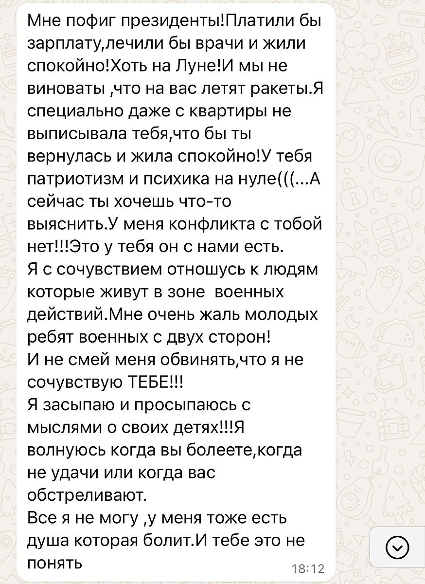 Автор— це чужі для Вас люди. Прийміть це. Рідні люди будуть жаліти рідну людину, а не квартиру чи кацапських «мальчіков».