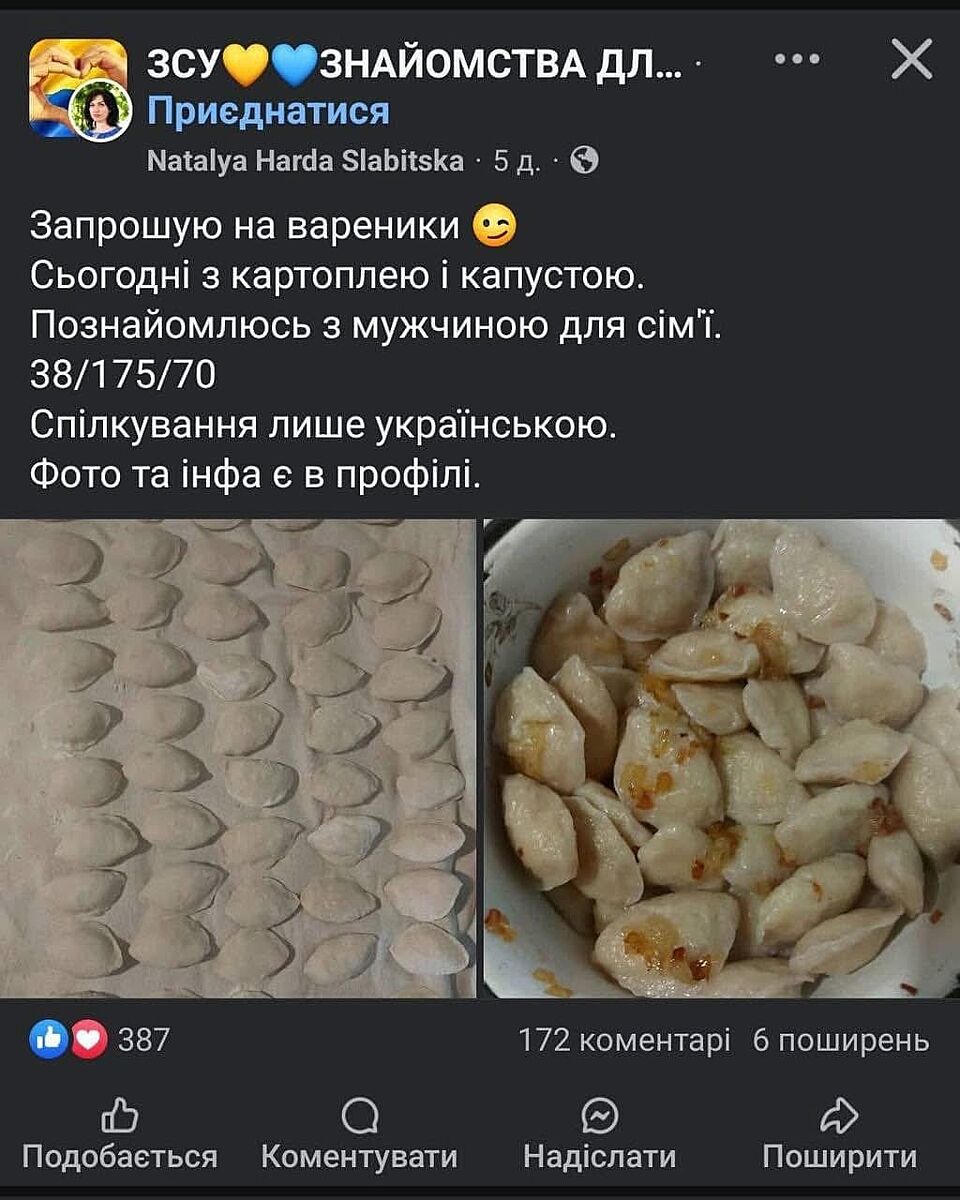 🤣🤣🤣🤣🤦🤦🤦🤦🤦 мій іспанський стид. Я в шоці. Тут теж таке було. Тільки то хлопці кидали, стіл вечеря, і запрошували приєднатися. Ще й ЗСУ знайомства. В них там раціон, ого-го. А тут вареники😂😂😅😅 не ті потрібно, ’вареники’ 😂😂😂