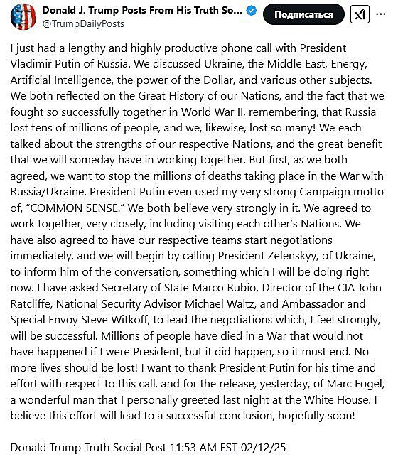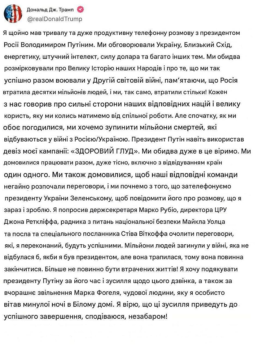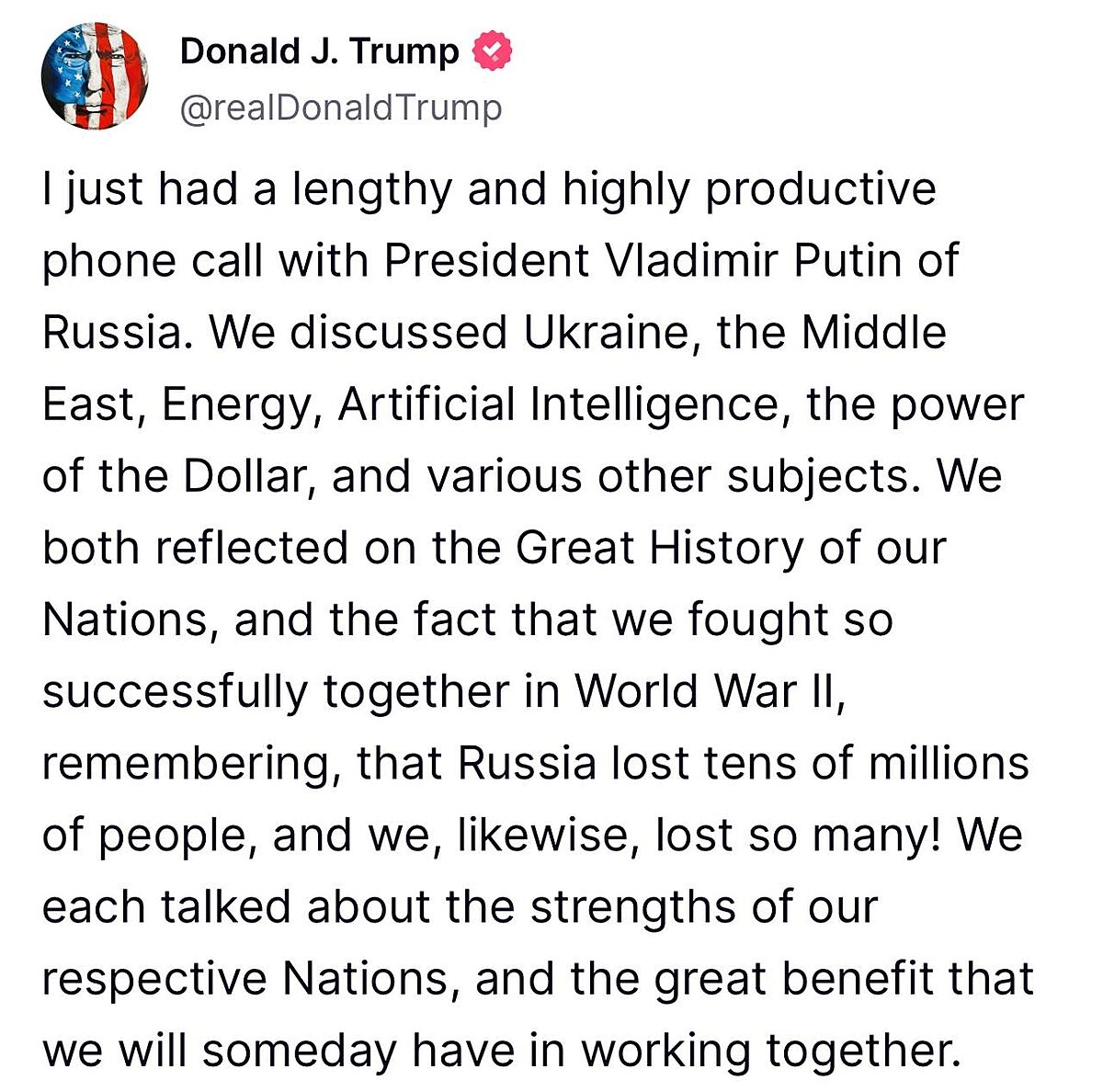 «У меня только что был долгий и очень продуктивный телефонный разговор с президентом России Владимиром Путиным. Мы обсудили Украину, Ближний Восток, энергетику, искусственный интеллект, силу доллара и другие темы. Мы оба размышляли о великой истории наших наций и о том, что мы так успешно сражались вместе во Второй мировой войне, вспоминая, что Россия потеряла десятки миллионов людей, и мы, также, потеряли так много!