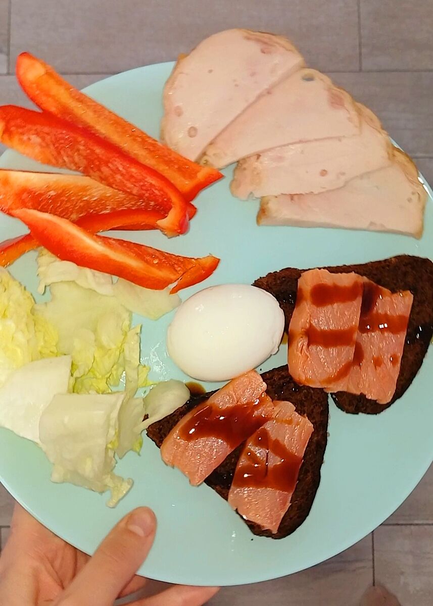 Так щодня +/-, буває риба червона, авокадо, яйця відварені ( більше люблю), щось м´ясне, якийсь фрукт.