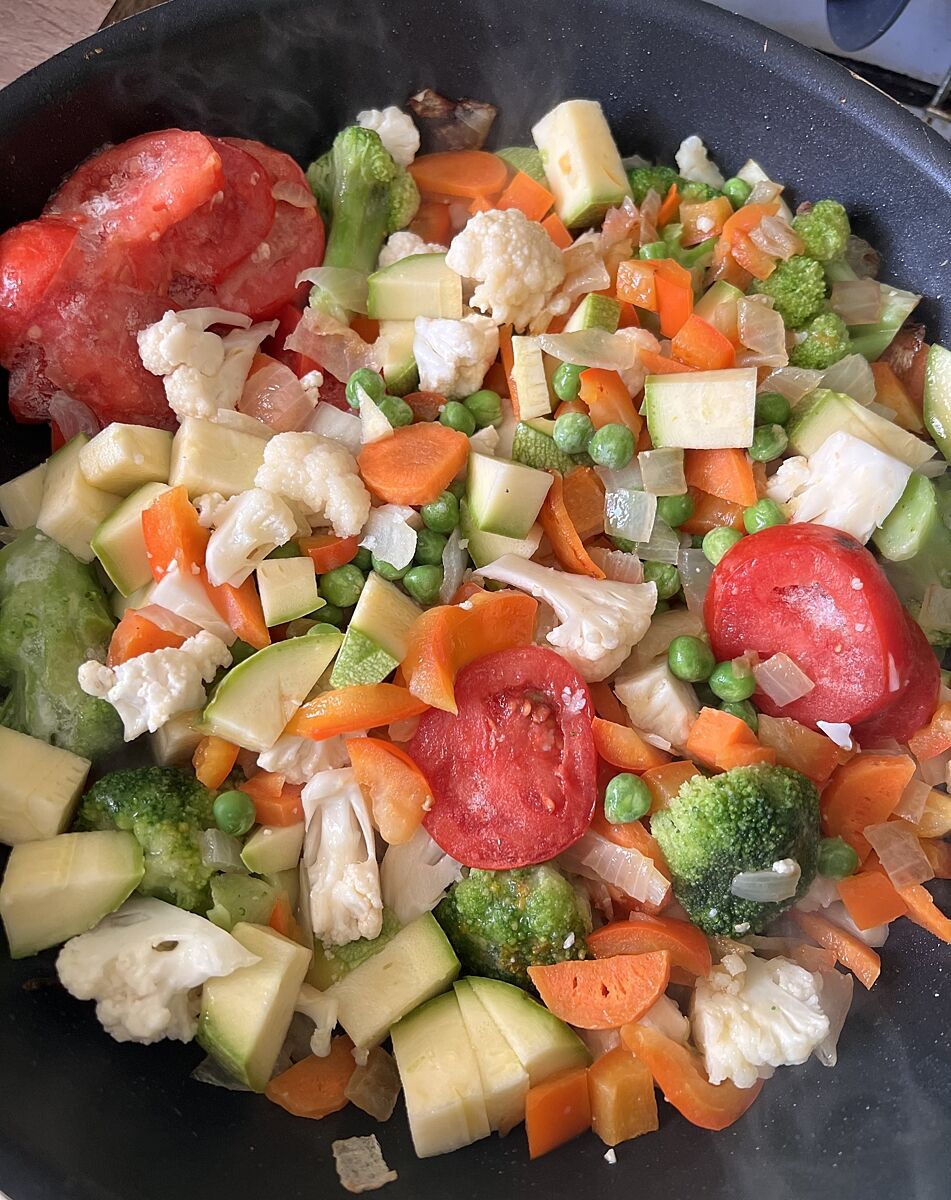 Я выше перечислила, кабачок, брокколи, цветная, белокочанная. Ну и перец, морковь, лук, помидорка. Я и заморозку использую, и свежие овощи.