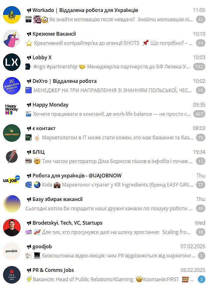 У мене кілька проєктів в роботі зазвичай, майже всі постійні і довгострокові. Тому прицільно не шукаю, хоча іноді моніторю ринок (ціни, вимоги в моїй сфері). Але цей перелік+робота.юа+ворк.юа+джинні (якщо ви в ІТ) на 80% закриють потребу в пошуках роботи. Інші 20% - це нетворкінг в фейсбуці та лінкедині.