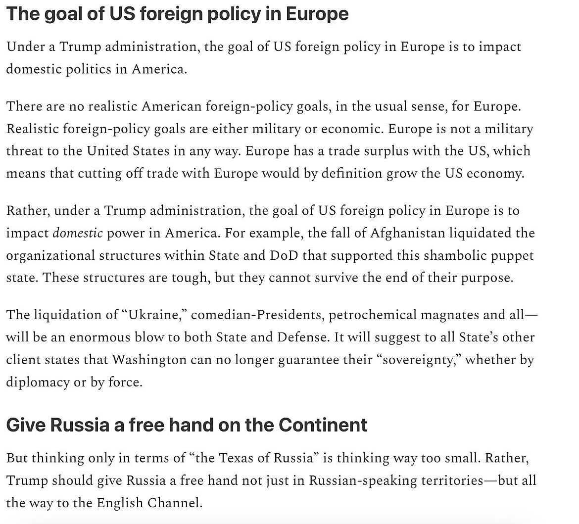 Там трохи розписано, чому треба здати Україну Росії та допомогти оркам пройтися ордою аж до Ла Маншу та демонтувати систему ліберальних демократичних цінностей. Ну бо вона застаріла.