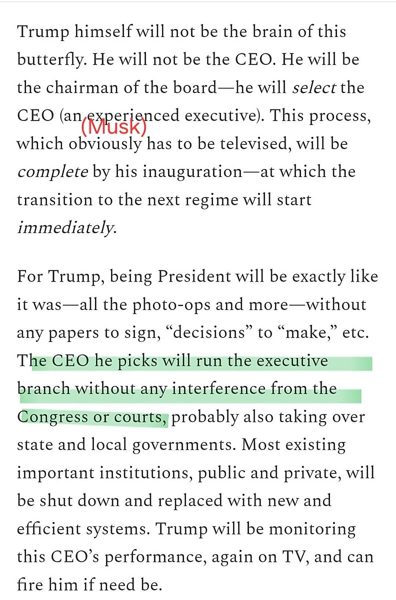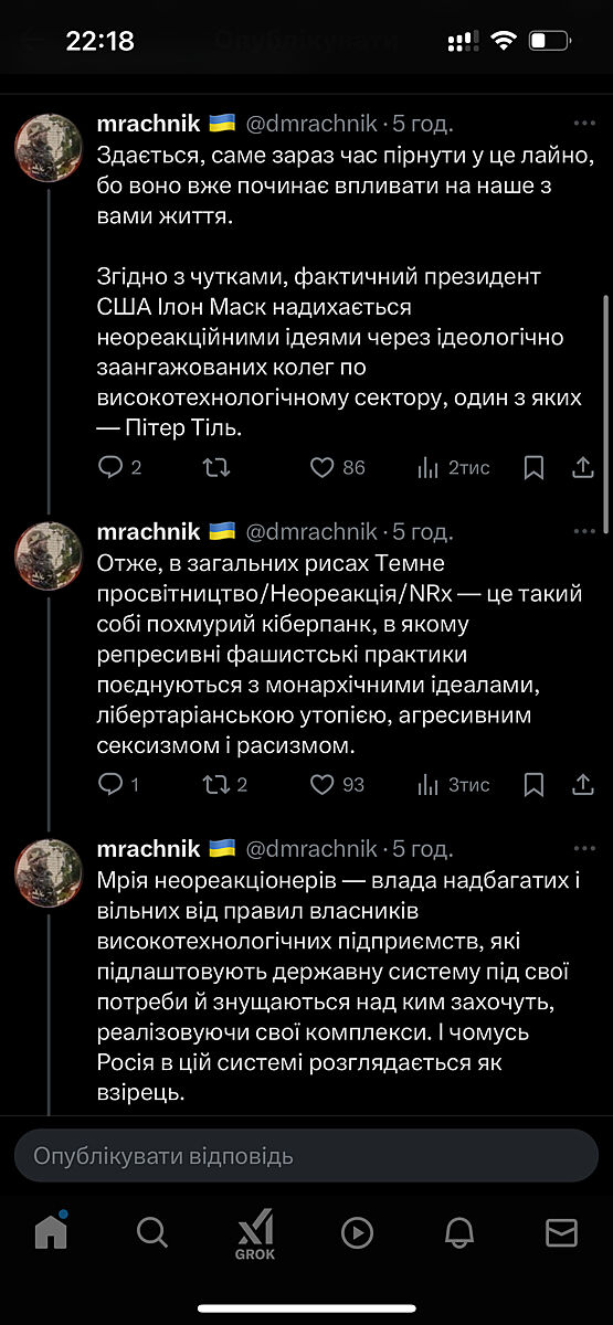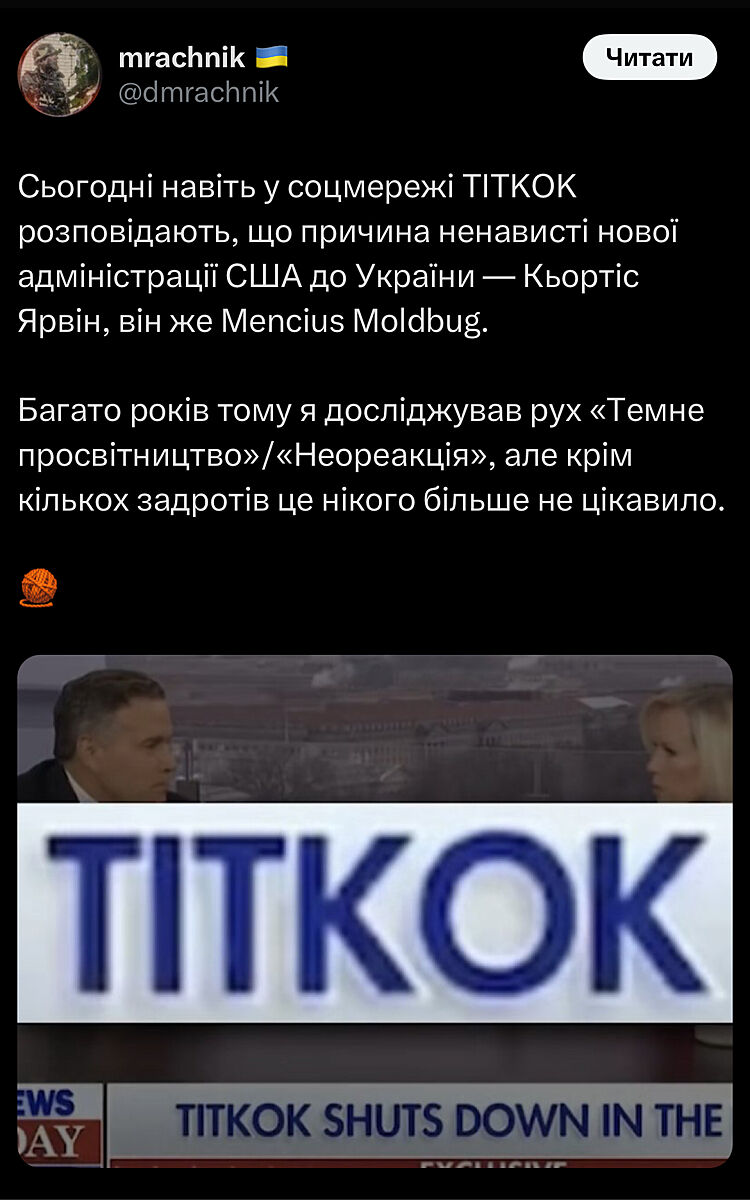 « Друзі, аби зрозуміти логіку дій США зараз, рекомендую прочитати статтю Куртіса Ярвіна, ідеолога Венса та Маска, написану напередодні повномасштабного вторгнення в 2022.
