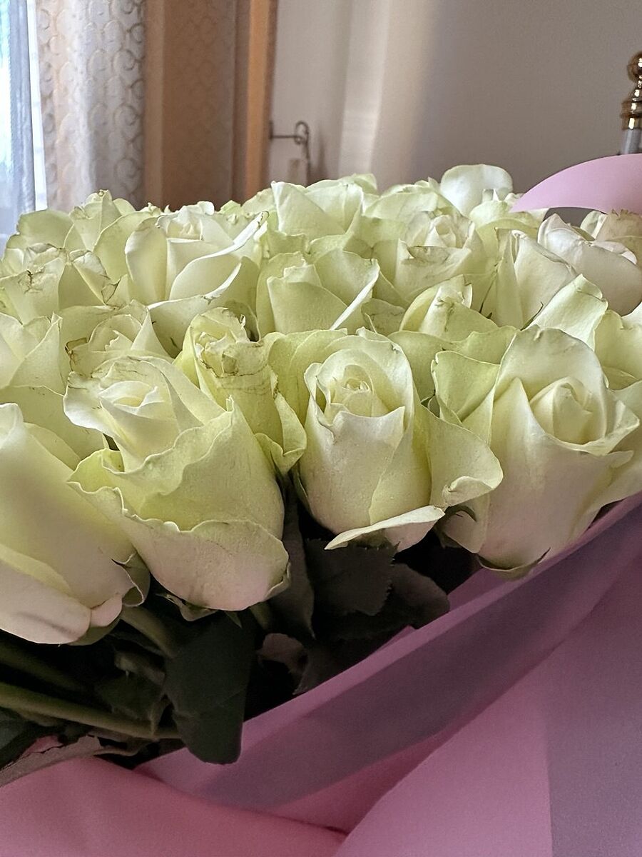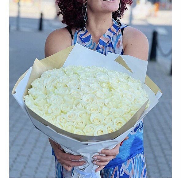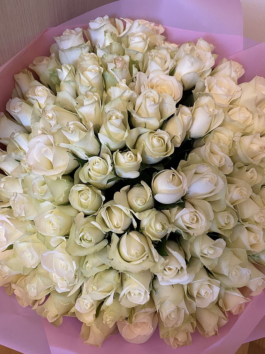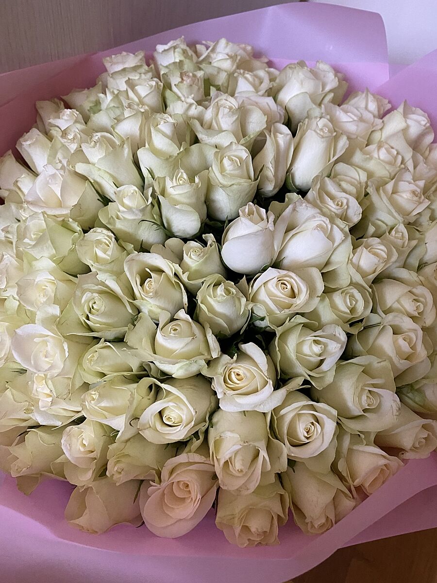 Заказывала цветы в интернет магазине, первое фото из их сайта (101 белая роза), второе фото мое я скинула, какие розы я ожидаю и хочу (раньше у меня он был, там было 71 роза, тяжеленный букет). Мне консультант ответила, что могут сделать такой же из таких же роз.