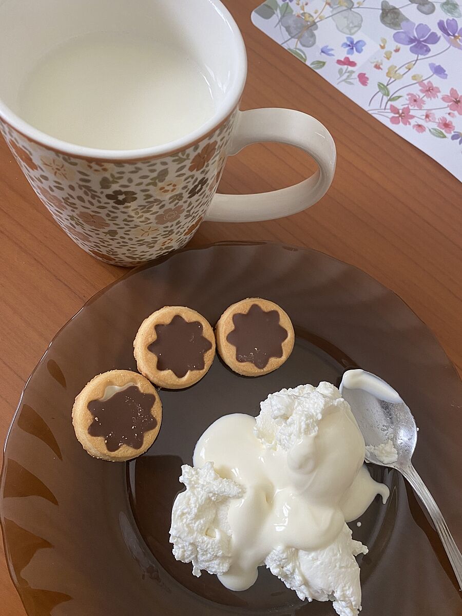 Я випила в 7 годині каву з молоком і цукеркою , в 9.30 сніданок - будете підсушений хлібчик з намазкою з баклажанів і кисломолочного сиру і солодкий чорний чай, яйце.