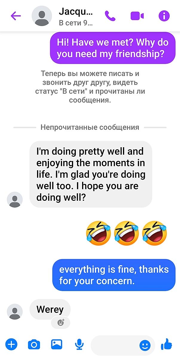 Не совсем понимаю ваш вопрос, я же добавила скрин разговора. Это похоже на что-то другое?