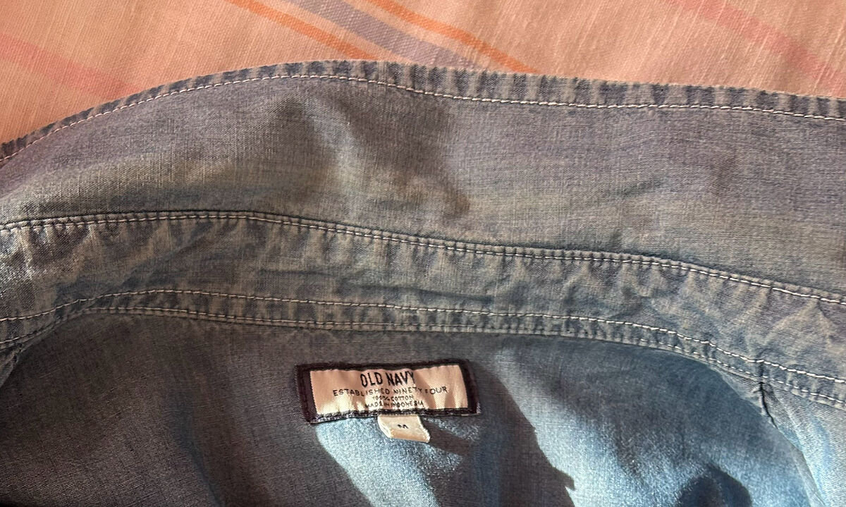 Никак не убрать. От пота краска выгорела. По хорошему выбросить. Ну или так ходить. Там сгиб то особо и не видно будет.