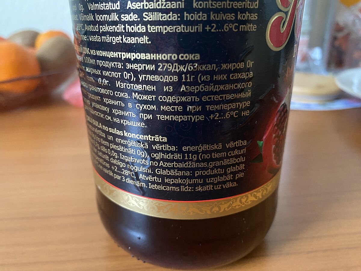 Заказала доставку продуктов и взяла гранатовый сок, на сайте был указан состав: 100% гранатовый сок. Пришла бутылка и в составе указано: «Гранатовый сок из концентрированного сока. Изготовлен из Азербайджанского гранатового концентрированного сока, может содержать естественный осадок.»