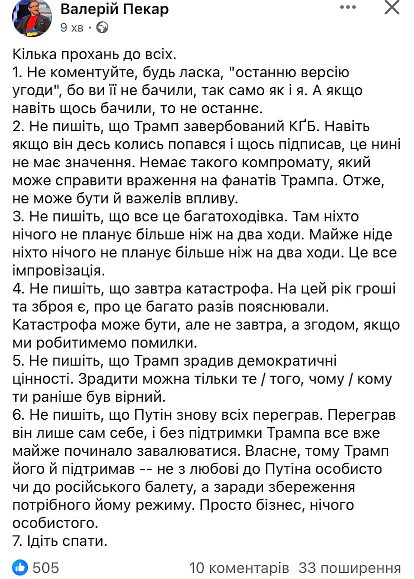 - Якщо Зеленський готовий пожертвувати владою заради миру, чи готовий він публічно прогарантувати, що виконає передвиборну обіцянку і не піде на другий термін? Якщо так, кого (можливо зі своєї команди) підтримає на посаду лідера держави? Зрештою, чому, на його думку, Трамп хоче підписувати угоду не з ним?