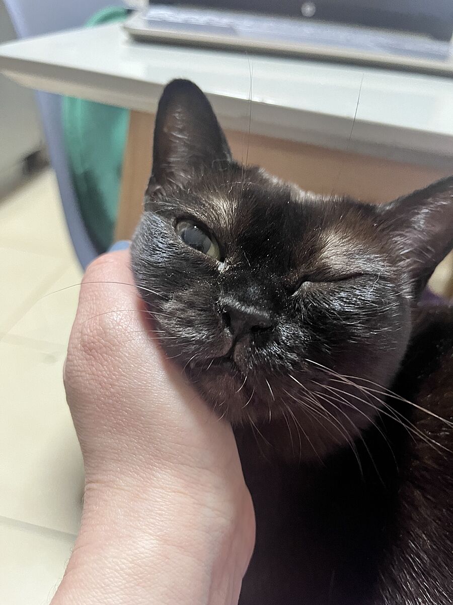 наш кот не блестит, он успел ночью убраться в гардеробной на всех верхних полках, но 17 лет разменял и мне кажется он доволен жизнью))