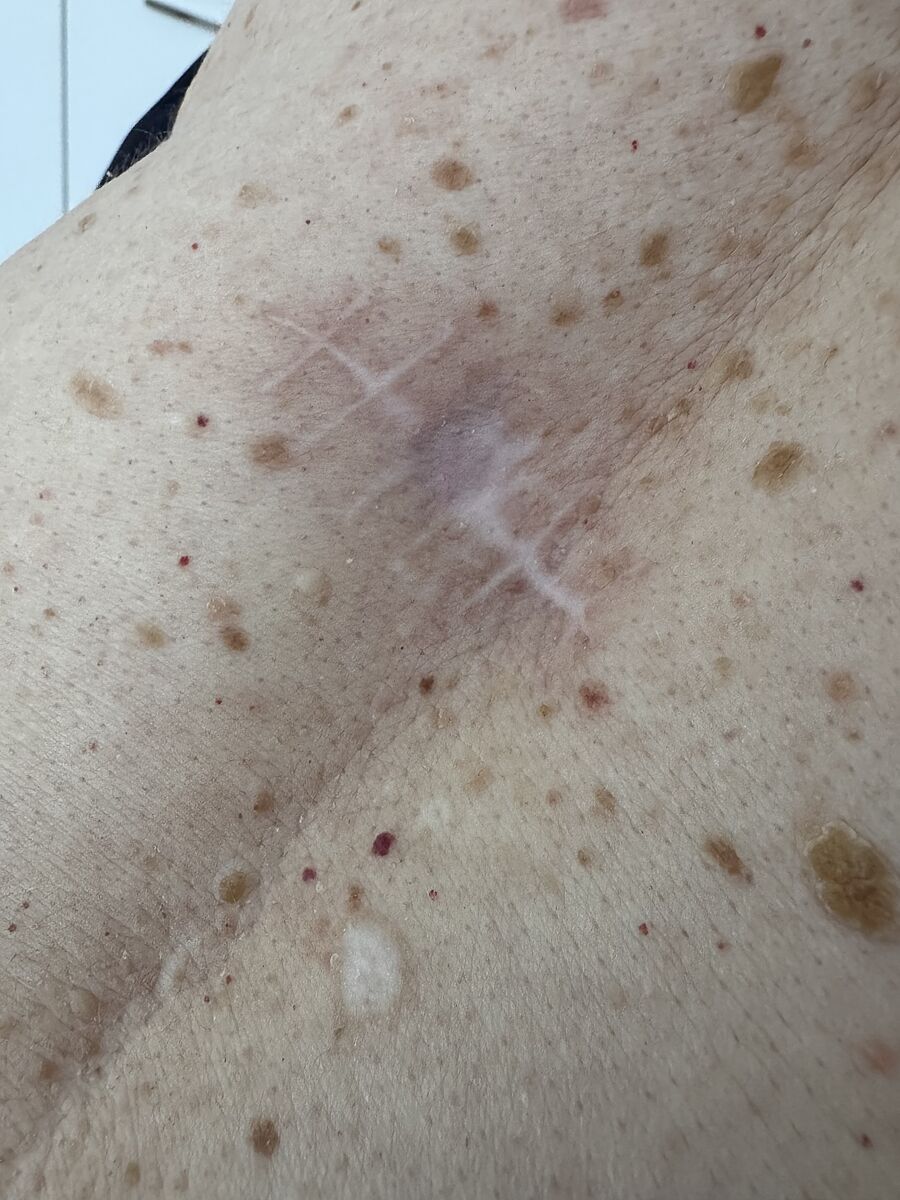Вырезал онколог вначале небольшое иссечение, потом гистология подтвердила и повторно операция с глубоким иссечением в КМКОЦ (Київський міський клінічний онкологічний центр), а попали туда по направлению из кожвендеспансера после осмотра этих кератом, думали что-то для иммунитета пропишут, потому что начали на лице лезть резко, так и нашли эту меланому, чисто случайно, так как мама себя сзади не видит… ну и еще КТ всего тела на метастазы делали