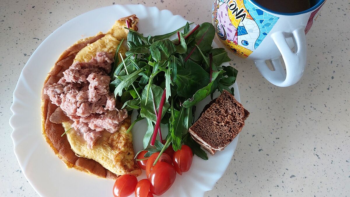 Свій сніданок не фотографувала. В мене овсяноблин з кавою. Так як хворію, каву допивала в ліжку