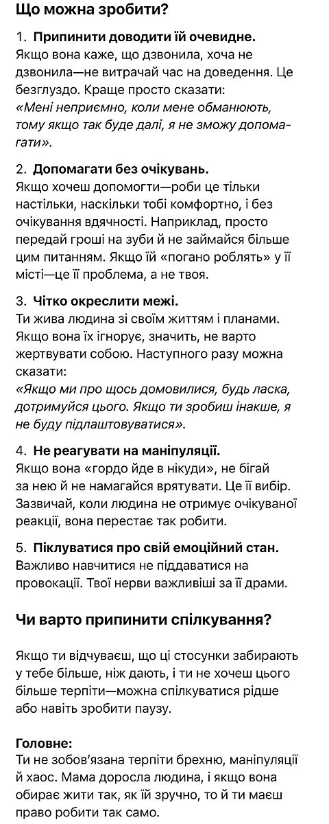 Ти не зобов’язана бути психотерапевтом для власної мами. Але й варто розуміти, що вона не зміниться. Тому головне питання — як ти хочеш жити далі: продовжувати цей хаос або віддалитися емоційно, щоб берегти свої нерви?