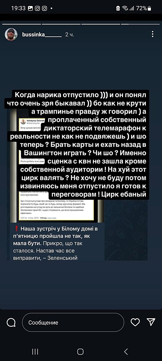 Знаете, я понятия не имею о протоколах поведения президентов, чтобы поддерживать диалог на компетентном уровне, но вот подозреваю, что Зеленский тоже не очень в теме, и это для нас, к сожалению, потому что от его действий мы зависим. Опять таки, не могу знать дипломатических тонкостей, но если не будет у пэтриота ракет, которыми сейчас сбивают то, что летит над моим домом, я это почувствую и мне это не нравится