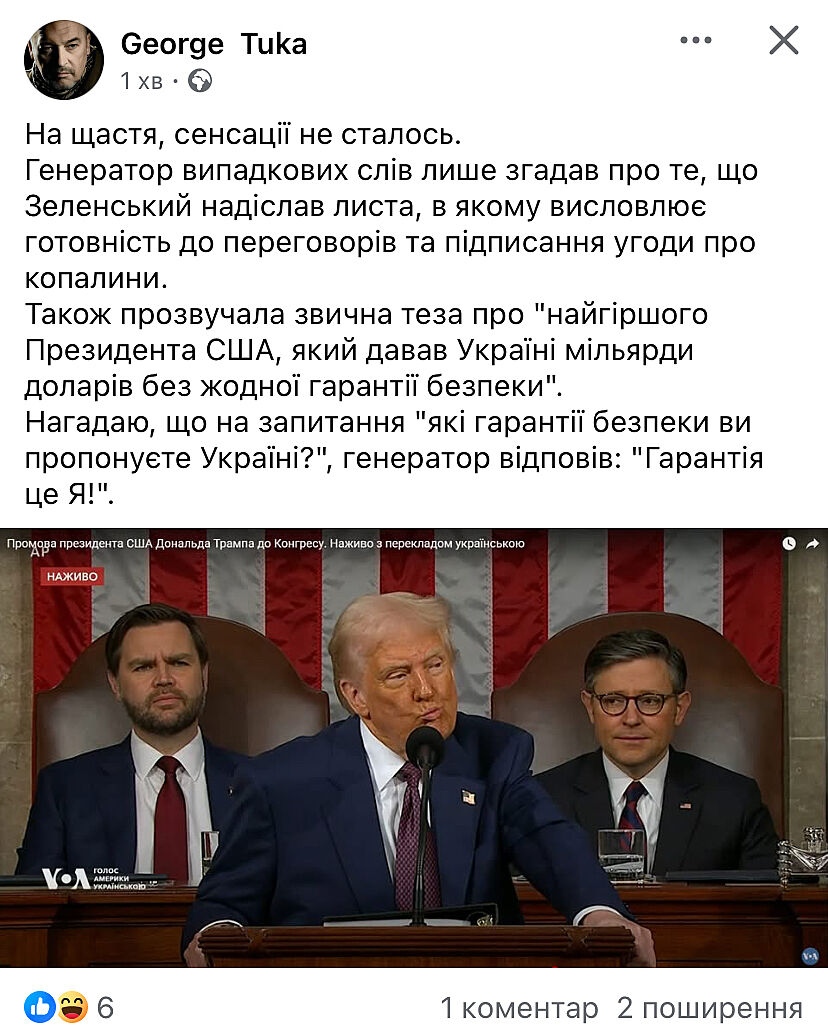 «Перший місяць нашого президента був найуспішнішим за всю історію країни. Ще більше вражає, аніж Вашингтон. Це номер 2» (тут я ще уточню, про Вашингтона). Овації.