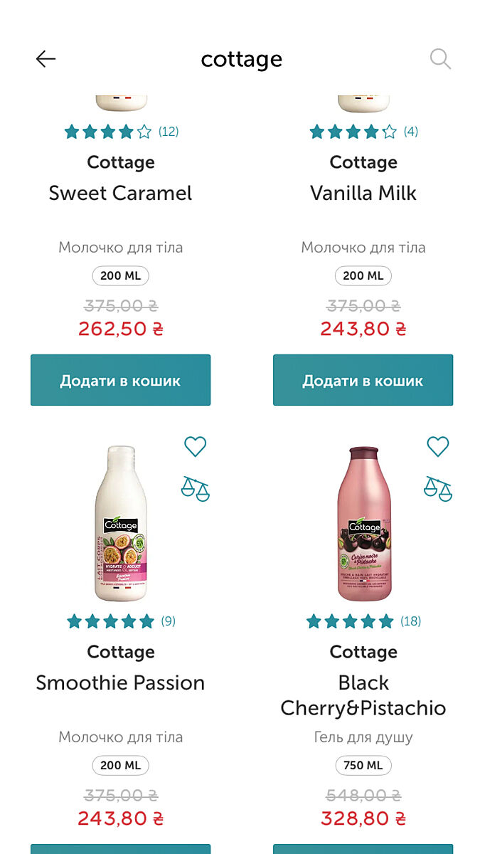 Можна придбати 5-6 шт різних кремів для душу Cottage в маленькому обʼємі 250 мл. Або набором з молочком для тіла