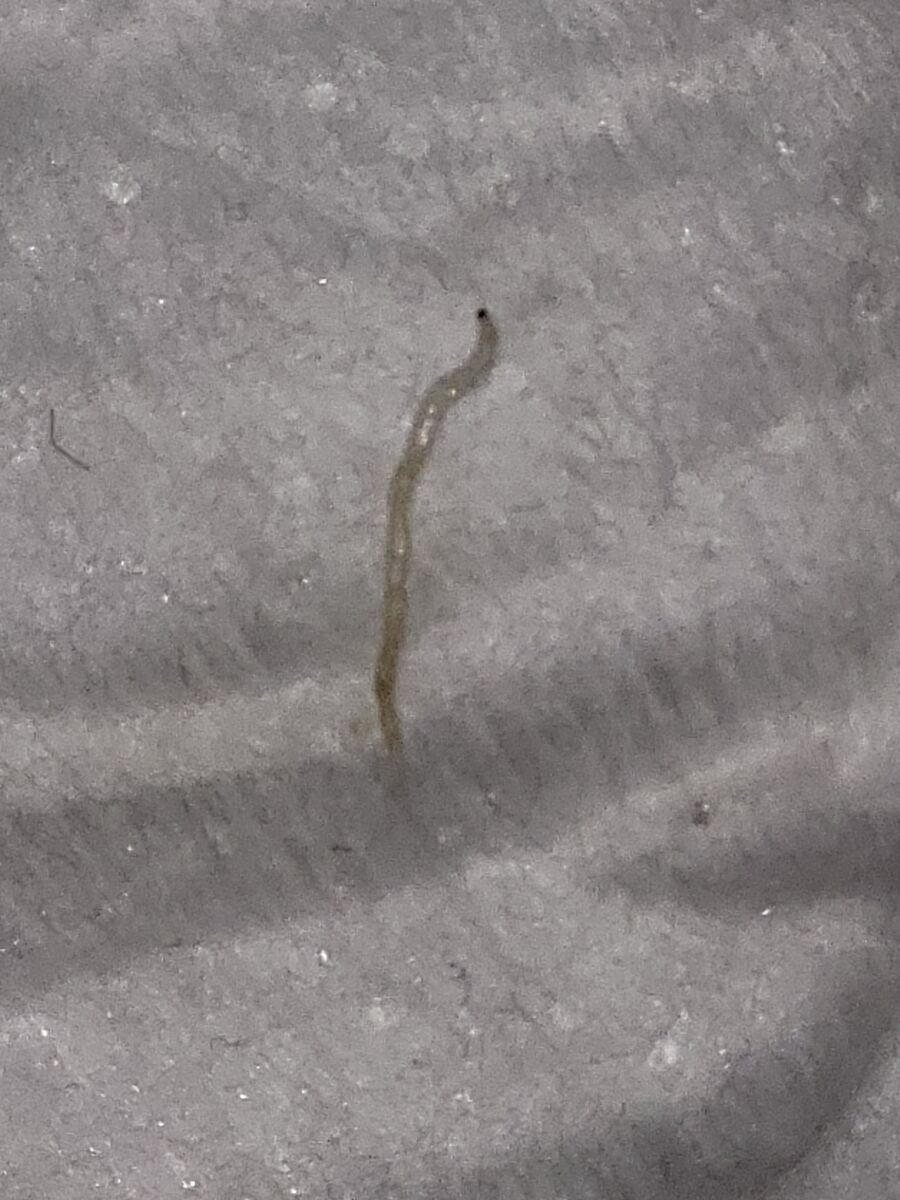Допоможіть, будь ласка. Сиджу вчора за столом, п´ю чай. Дивлюся, а на столі(стіл чорного кольору) якась ниточка біла рухається. Я придивилася, а це тоненький черв´як, приблизно 1см, дуже тоненький. Я сфотографувала. Ніколи такого не бачила. Що це може бути?